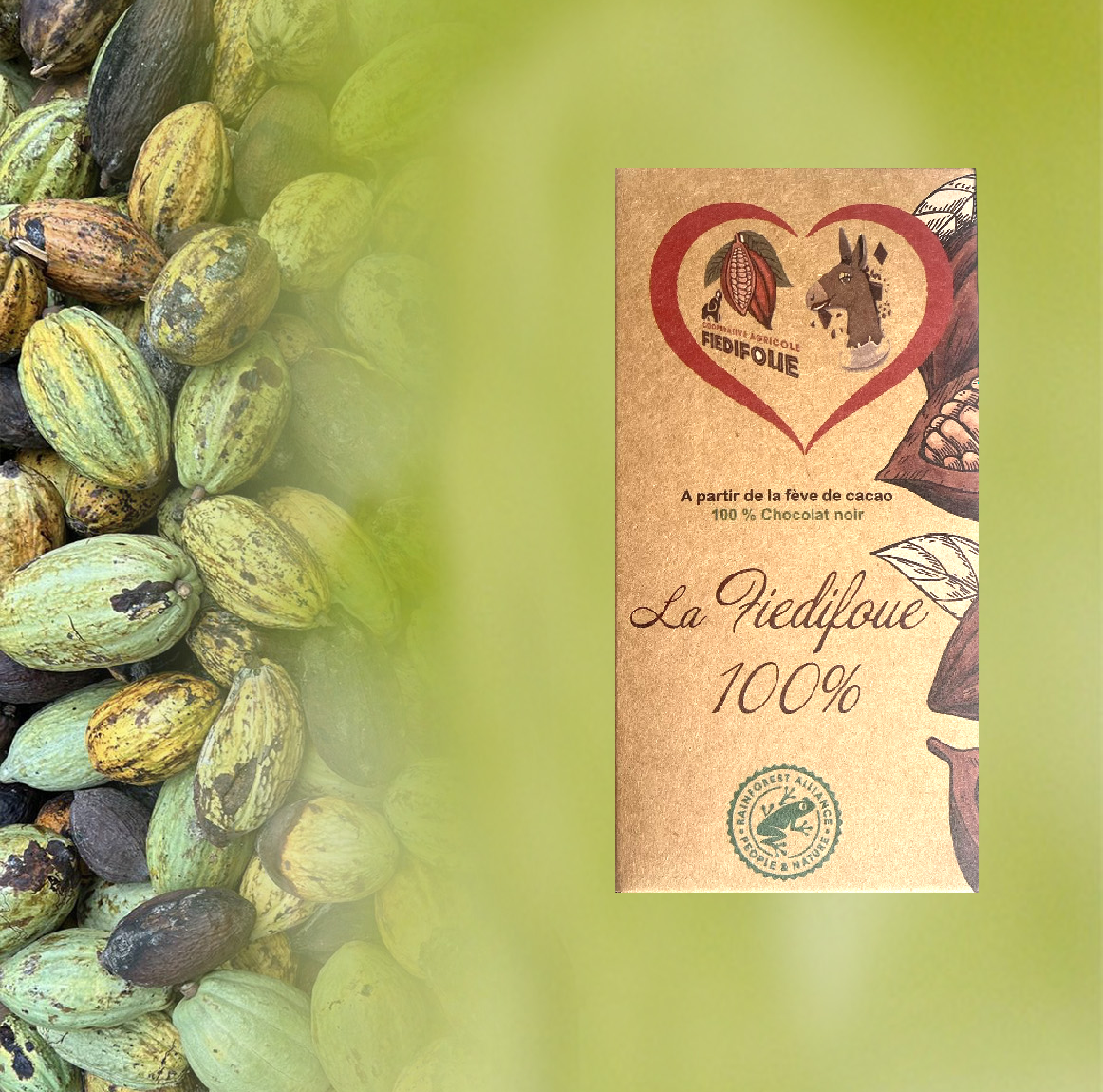 La tablette 100 % est une expression brute et authentique du cacao ivoirien: aucun sucre, aucun ajout, rien que de la fève. Elle révèle la force identitaire du terroir de Taabo tout en valorisant le travail exigeant des producteurs de la coopérative Fiédifoué.